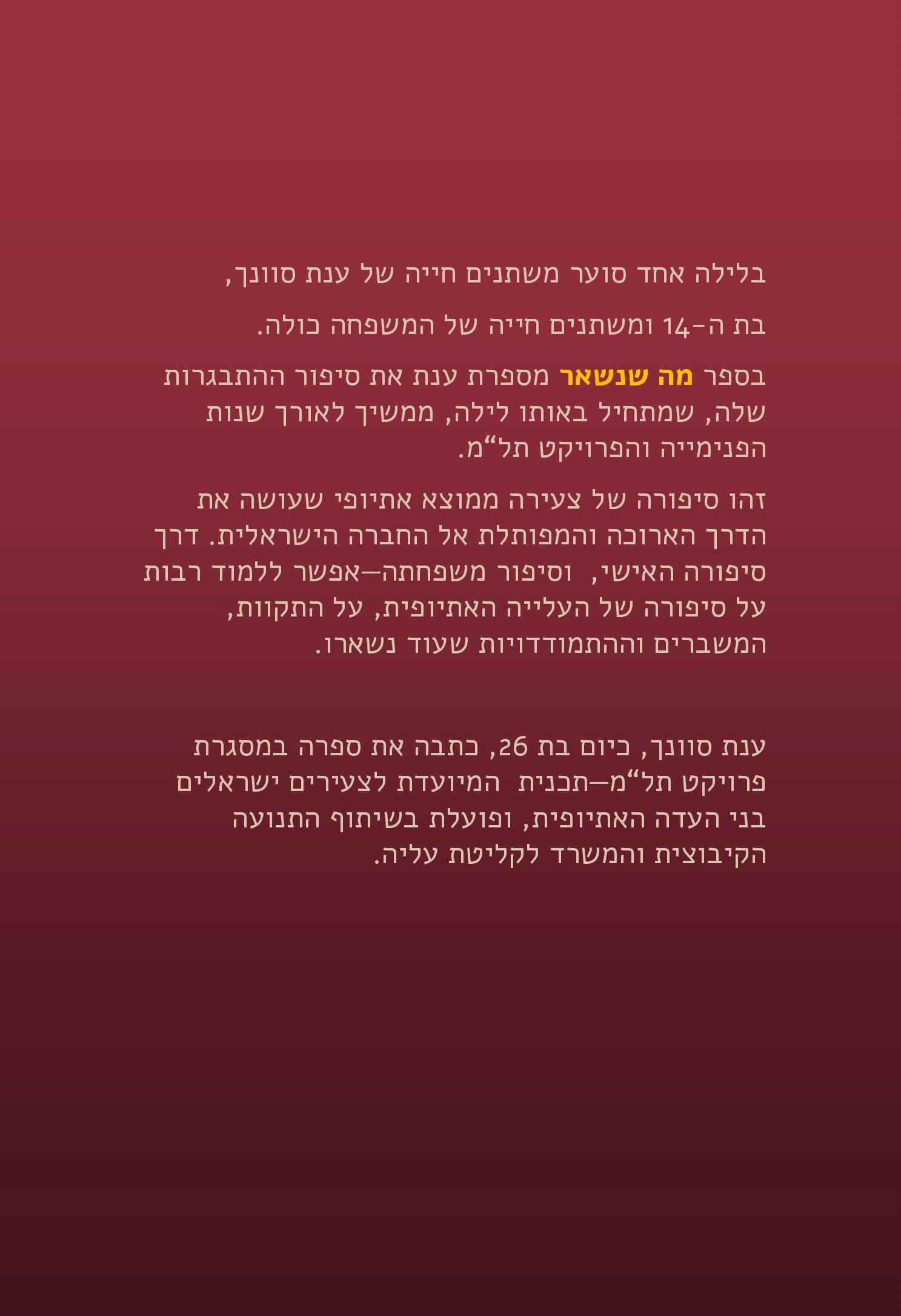 ענת סוונך היא רק בשנות העשרים שלה וכבר כתבה את סיפור מסע ההתבגרות שלה – בת למשפחה אתיופית שנולדה שם וגדלה כאן. הסיפור נפתח בעזיבתה של האם את הבית ונמשך לאורך שנות ההתבגרות של ענת, האלכוהול, הבלבול, החיפוש והמציאה של מסגרת חדשה שמעניקה לה כיוון. הספר נכתב במסגרת פרוייקט תל"ם.