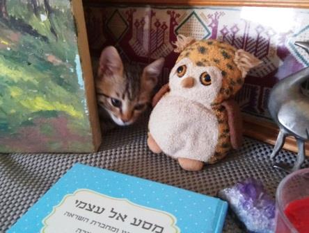 לא הצלחנו להיפרד, אז לקחנו אותו איתנו. בינתיים. מיץ מספק בידור שאין לו תחליף. קפיצות וזינוקים, ליקוקים ושריטות. הוא כבר יודע מתי הולכים לרוץ, מה עושים כשחוזרים (מחכה במקלחת…) ומשתלט על כל מקומות המחבוא הטובים. (כן, עכשיו הוא מסתתר מאחורי הציור והואיל להציץ למצלמה).