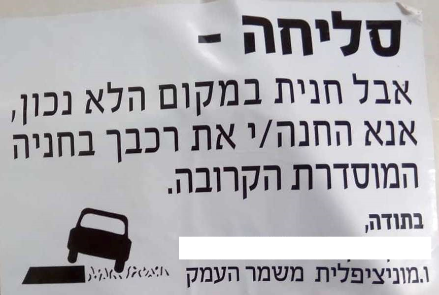 ביום האחרון לשהותנו הנוכחית בקיבוץ חנינו מאחורי המעדנייה (המכולת הקיבוצית, הכלבו") הלכנו לאכול ארוחת צהרים עם אבא בחדר האוכל המשופץ לתפארת ואחר כך ערכנו קניות. לכל זה היתה לנו חצי שעה לפני שהיה עלינו לזוז אל רופא השיניים ביקנעם. מגרש החנייה היה כמעט ריק. זו היתה שעת צהריים רדומה בקיבוץ – ולכן הופתענו לגלות את המדבקה הבאה על חלון המשאית (שם המדביק ומספר הנייד שלו מוסתרים כאן, גלויים במקור):