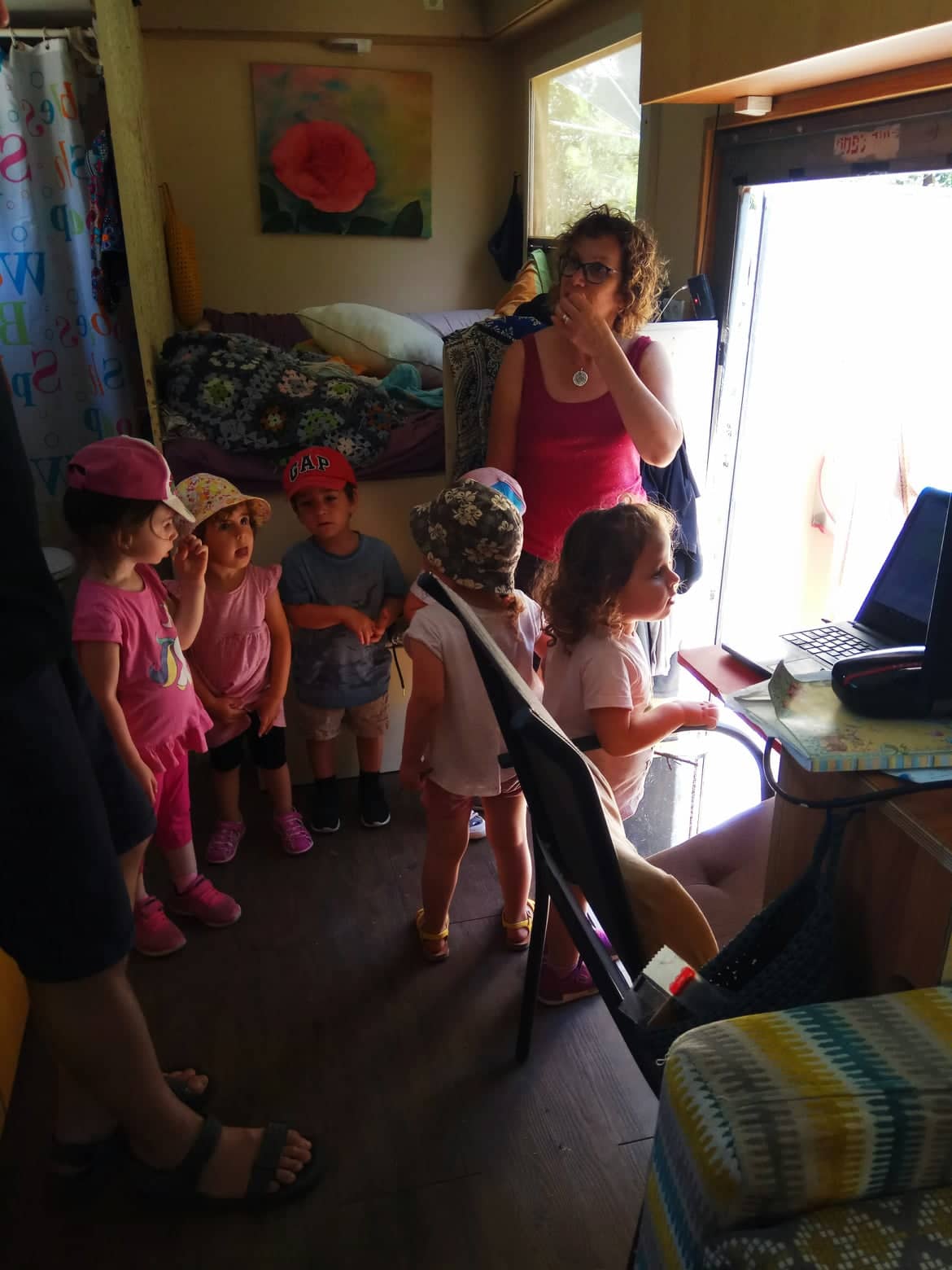 כשאנחנו מגיעים למשמר העמק עם המשאית, אנחנו חונים למעלה – ליד מערת הפלמ"ח. רחוק מבתי החברים, קרוב ליער ולבריכת שחייה. ולבית הקברות. משם אנחנו יורדים לחדר האוכל, לביקור אצל אבא (שגם מגיע אלינו מדי פעם בקלנועית, לשתות תה) ואצל אחותי ומשפחתה. אני אוהבת לפגוש את חברי הקיבוץ, ויש כמה מהם שחיינו נקשרו אלו באלו, למרות שעזבתי. בביקור הנוכחי, שנמשך יום וחצי, ניצלתי את הזמן לשחיה בבריכה הנפלאה של הקיבוץ, לשיחה עם המציל, ולאירוח ילדי הפעוטון שטיילו ביער וקפצו לביקור.
