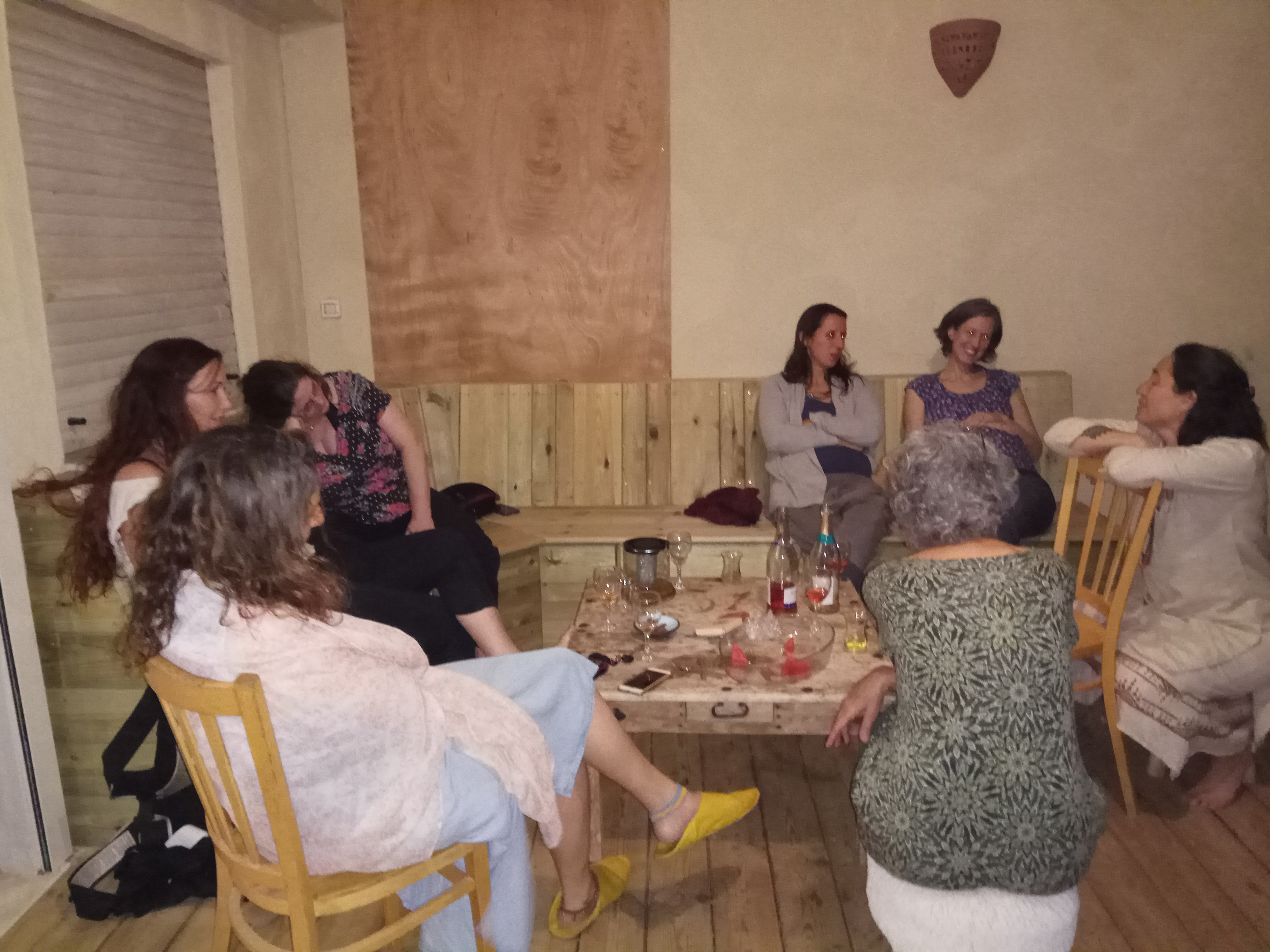 כבר בשבוע שלפני בואנו ליהי כתבה לי שב-6.6 יהיה יום לידות הבית ושאולי נעשה משהו ביחד. אמרתי מיד כן. בלי לדעת מה נעשה בדיוק. באותו היום נשבה רוח מזרחית חזקה מאד וביטלנו את המדורה לאלתר לטובת המרפסת המחודשת של ליהי ועדי. לפנות ערב התאספנו, חבורה של נשים: שלוש מיילדות בית, אחת עם תינוקת, שתי הריוניות בדרך ללידת בית, שתי יולדות בית ותיקות ואני. סבב ההיכרות נמשך שעתיים. הסיפורים היו פשוט מרתקים. וכל אחת מהיושבות במעגל שיתפה ברגעים משמעותיים, מלידות הילדים ועד ללידות של דברים אחרים. ובין לבין שתינו יין ותה, טעמנו שוקולד פנדה ואבטיח וקשקשנו על מיליון נושאים, כולל התייעצות דחופה מה לעשות עם יולדת בית מאד כאובה בעקבות טלפון שדיווח שהיא לא מתקדמת בלידה.