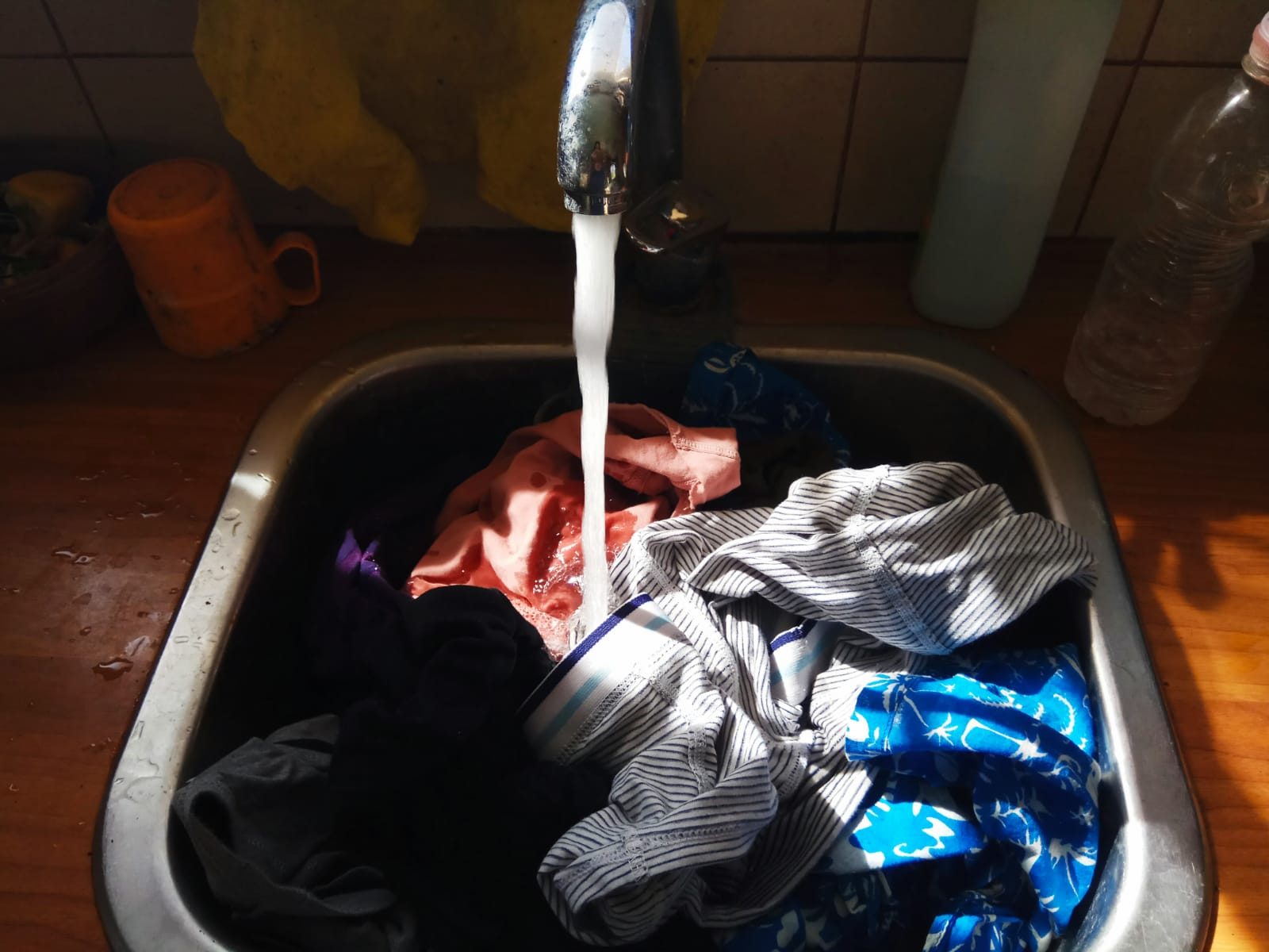 אחת לשבוע אנחנו עושים כביסת-יד ללבנים, בגדי ריצה ופריטים שימושיים (על בגדים – ראו כאן), השרייה ארוכה בנוזל כביסה אקולוגי ואז שטיפה, שהיא זו שבאמת צורכת הרבה מים. עכשיו בתכנון (שלו) לרכוש מכונה קטנה, לא חשמלית, לכביסה, שתחסוך עוד יותר במים ותוציא את הכביסה עוד יותר נקיה.